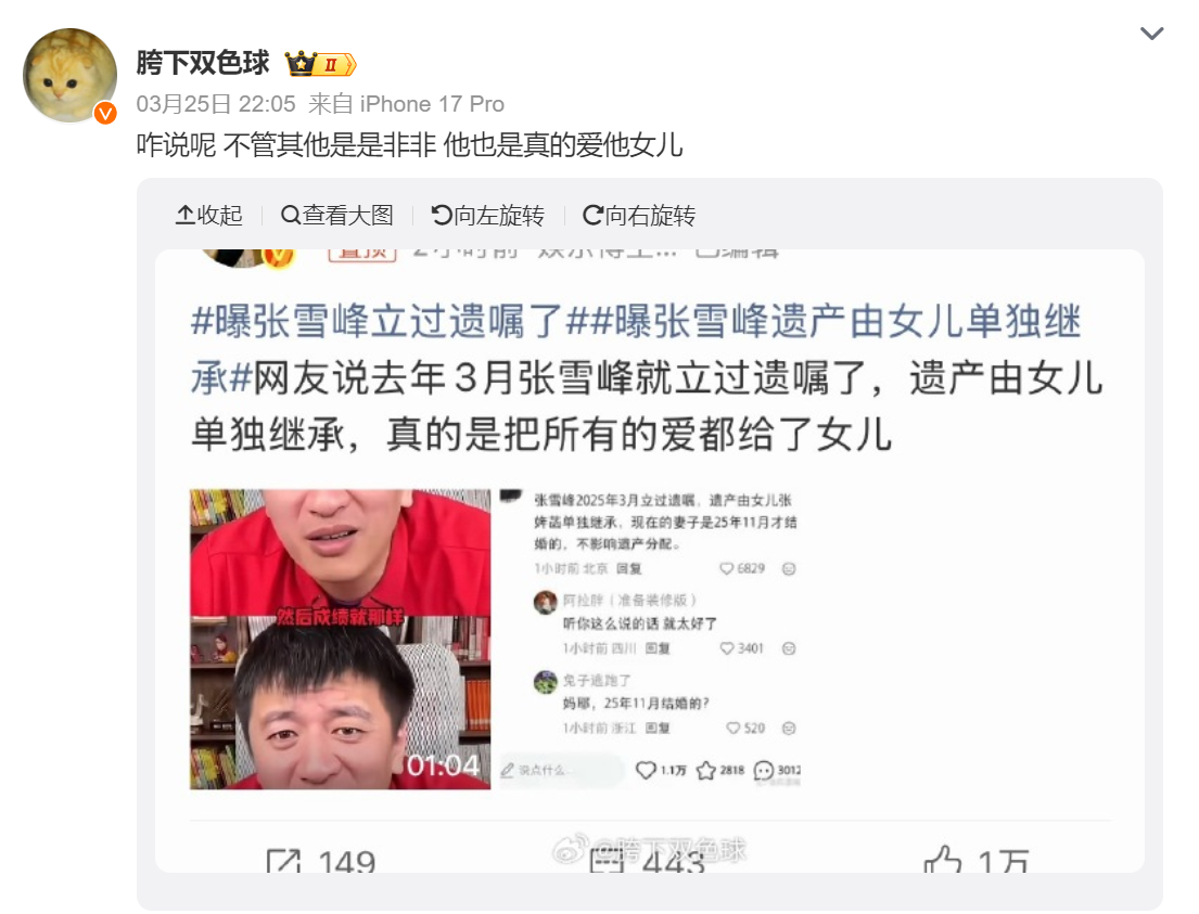 网传消息进一步细化了遗嘱的内容。据悉,张雪峰在2025年3月就已订立相关条款,明确指定其独生女儿为唯一继承人。