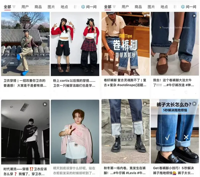 豆包的时尚感,是有迹可循的。它偏爱“单肩穿外套、露一侧胳膊”的穿法,这是一些明星带火的潮流。而看似突兀的“卷裤脚”,也并非凭空生成。这一细节最早可追溯至19世纪末,起初是为了防尘与实用。到了20世纪50年代,卷裤脚逐渐被青年文化吸纳,成为对正装秩序的轻微反叛。直到今天,它依然作为一个被反复调用的时尚符号,周期性地回到人们的视野中。