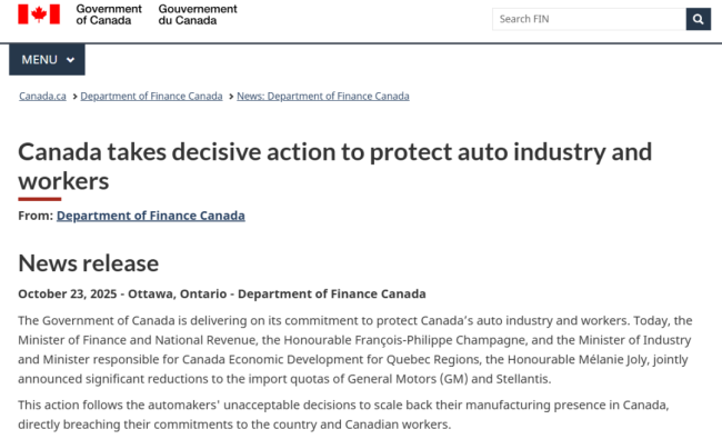 10月23日,两位部长宣布,立即生效,政府将通用汽车可以免关税进口的美国组装车辆数量降低24%,并将Stellantis的数量削减50%。