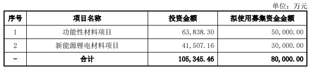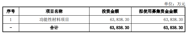 调整情况:募资总额由8亿元减少至6.38亿元,缩水1.62亿元;项目数量由2个变为1个,取消“新能源锂电材料项目”,聚焦于“功能性材料项目”,项目投资额增加约1.38亿元。