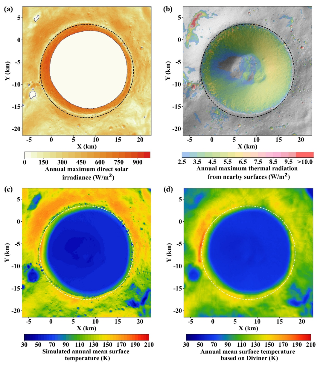 在沙克尔顿撞击坑内,年平均表面温度的数值大小分布不均;坑底较平坦区域的平均温度更低(图2c)。