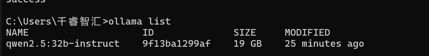 执行 ollama list,终端会显示 qwen2.5:32b-instruct