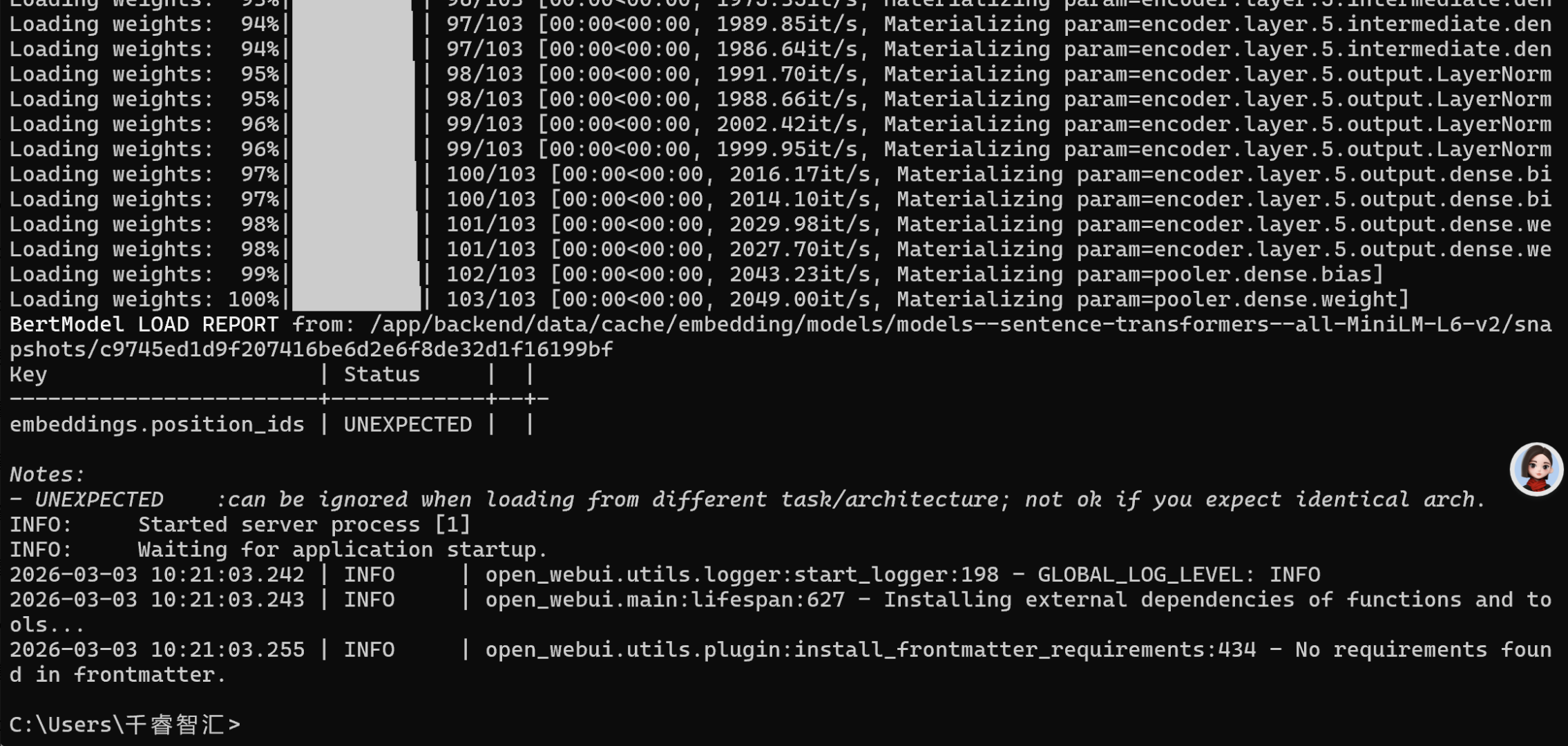 Started server process [1]→ Web 服务已启动Waiting for application startup→ 服务正在等待请求- 没有出现连接 Ollama 的错误 → 容器已能正常连接 Ollama