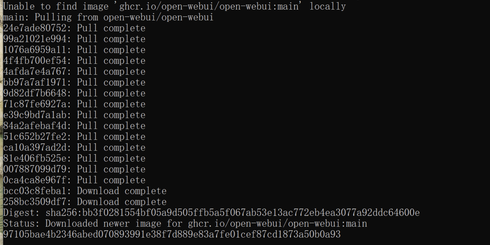 IMAGE 列为 ghcr.io/open-webui/open-webui:main 的那一行,复制它的 CONTAINER ID(通常是一串 16 位的字符,如 97105bae4b23)。