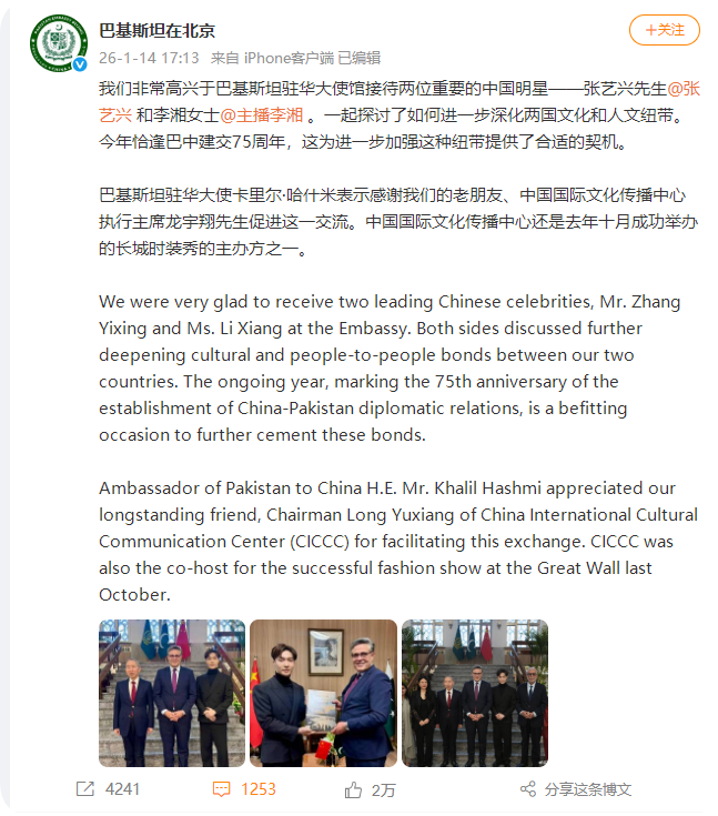 1月14日,她与艺人张艺兴一同现身巴基斯坦驻华大使馆。今年恰逢中巴两国建交 75 周年,李湘此次到访参与探讨了深化两国文化与人文交流合作的相关议题。