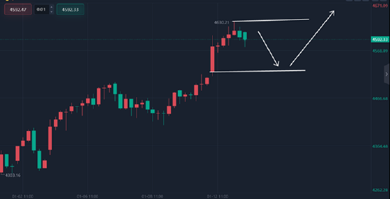 当前盘面来看,目前冲高回落有顶部形构图,今天要注意周期变化!在黄金阶段性突破4550后,连续一个交易的上涨,现在黄金已经走高至4630,也就是说,黄金向上突破了80美金,其实这个力度不管走多少都合理,属于市场正常的避险价值体现,前面强调的,黄金上涨后不猜顶,也就基于这个原则。那么,在原则之内,如果要出现调整空间,也需要做出应对策略,周一的大涨,技术面日线表现不明显,但H4周期开始有顶部形态,或有一波较大的调整空间,目前连阴下行确定,今天可能会继续走低至4550,4500,如果这样走出来,那么,日线收阴,周二调整后,本周黄金就是一个高位震荡了。所以,自4630开始到4500这波大空间也需要关注。杨呈发建议,从今天开始可以尝试性做高空看回落空间,下方至少看到4520/4500。另外,今天有美CPI数据公布,这是体现美市场经济的重要指标,也是1月美联储是否降息的重要风向标,需要着重关注!