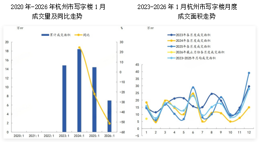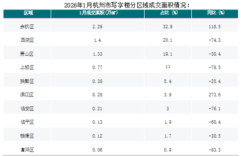 2026年01月,杭州写字楼成交面积为6.97万㎡,同比下降51.47%;写字楼成交套数为317套,同比下降46.54%。