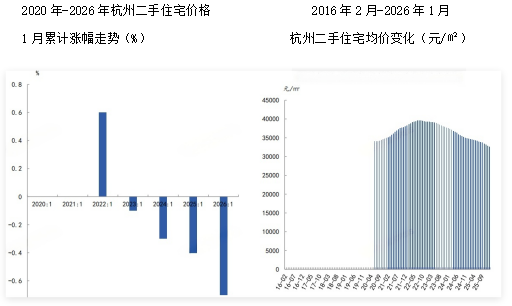 2026年1月,杭州二手住宅均价32613元/㎡同比下跌6.00%,跌幅较去年同期收窄1.47个百分点。