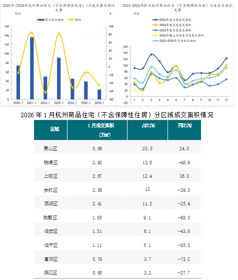 2026年1月,杭州商品住宅(不含保障性住房)成交面积为21.5万㎡,同比下降45.1%;商品住宅(不含保障性住房)成交套数为1373套,同比下降52.9%。