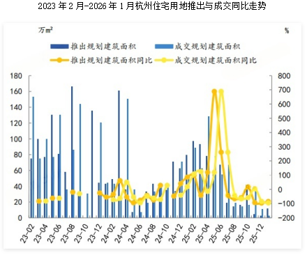 2026年1月,杭州共推出住宅用地规划建筑面积11.33万㎡,同比下降85.66%;杭州成交规划建筑面积2.62万㎡,同比下降95.06%。