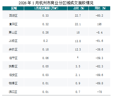 2026年1月,西湖区、富阳区、萧山区等区域为杭州商业成交主力区域,共成交0.91万㎡,占城市成交面积的62.8%。其中, 成交面积同比增长的区域有富阳区等,同比分别增长195.0%;成交面积同比下降的区域有临安区、滨江区、钱塘区等,同比分别下降89.6%、78.0%、69.8%。