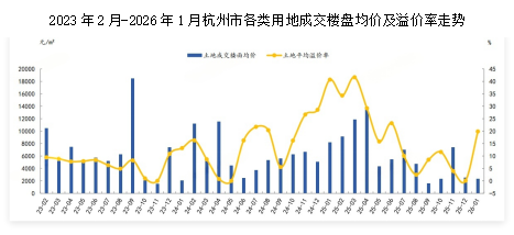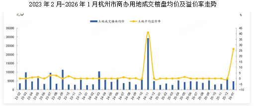 2026年1月,杭州成交楼面均价为4730元/㎡,同比上涨77.89%;平均溢价率为26.27%;商办用地出让金达11.73亿元,同比增长38.48%。