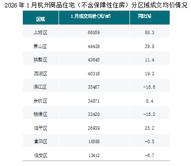 2026年1月,上城区、萧山区、拱墅区等区域为杭州商品住宅(不含保障性住房)成交均价最高区域。其中,成交均价同比上涨的区域有上城区、萧山区、临平区等,同比分别上涨88.3%、29.8%、25.2%;成交均价同比下跌的区域有滨江区、钱塘区、临安区等,同比分别下跌 16.6%、16.2%、6.7%。