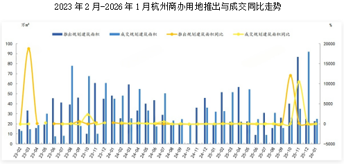 2026年1月,杭州共推出商办用地规划建筑面积22.59万㎡,同比增长20.52%;杭州成交规划建筑面积24.8万㎡,同比下降22.15%。