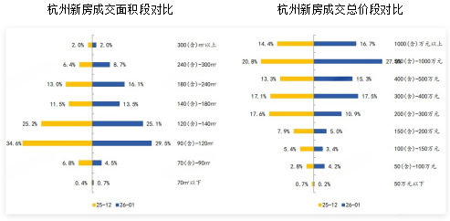 2026年1月,从面积段来看,杭州90(含)-120㎡面积段成交套数最多,达405套,占比为29.5%,较上月收窄5.1个百分点。