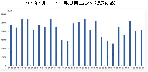 2026年1月,杭州商业成交均价为20590元/㎡,同比上涨12.6%。