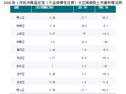 2026年1月,萧山区、钱塘区、上城区等区域为杭州商品住宅(不含保障性住房)供应主力区域,共供应11.44万㎡,占城市供应面积的 62.3%。其中, 新批上市面积同比增长的区域有临安区、萧山区等,同比分别增长71.6%、68.2%;新批上市面积同比下降的区域有余杭区 、临平区、西湖区等, 同比分别下降87.0%、85.4%、62.4%。。