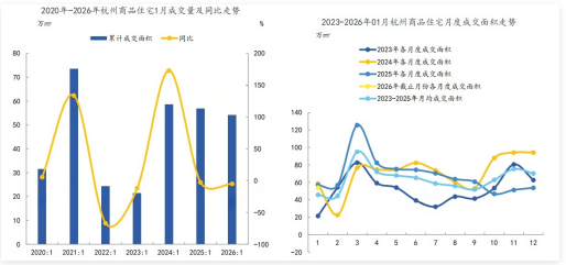 2026年01月,杭州商品住宅成交面积为54.00万㎡,同比下降5.12% ;商品住宅成交套数为5438套,同比下降1.07%。