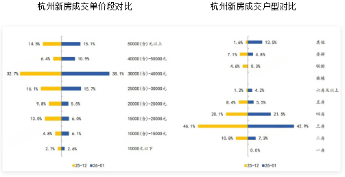 2026年1月,从户型来看,杭州三房户型成交套数最多,达589套,占比为42.9%,较上月收窄3.2个百分点。