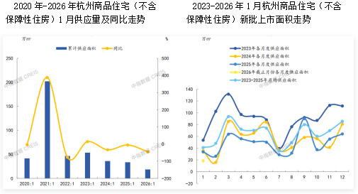 2026年1月,杭州商品住宅(不含保障性住房)月均新批上市面积为18.4万㎡,同比下降45.3%。