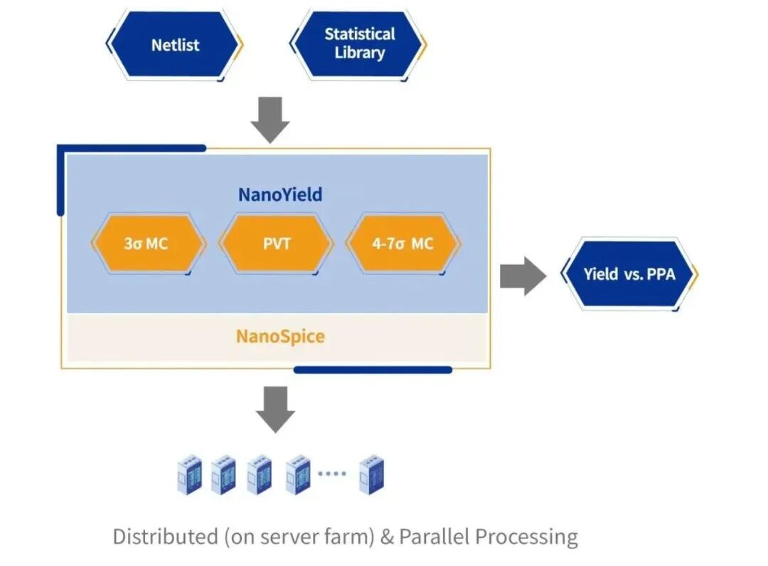 随着芯片工艺向先进节点持续演进,工艺随机扰动显著压缩设计裕量,高端芯片的性能提升与良率优化面临严峻挑战。良率导向设计(DFY)作为芯片流片前的关键环节,通过先进统计仿真工具实现良率的精准分析与优化,直接决定芯片产品的可靠性、量产能力及市场竞争力。现代高端芯片(如CPU、GPU、AI芯片及各类存储芯片)包含数以亿计的重复单元,先进工艺下,晶体管或寄生器件的工艺随机扰动易导致个别单元失效,单元失效率需精准覆盖6 sigma及更高维度;而传统仿真手段往往需要数月时间,难以满足研发效率需求。