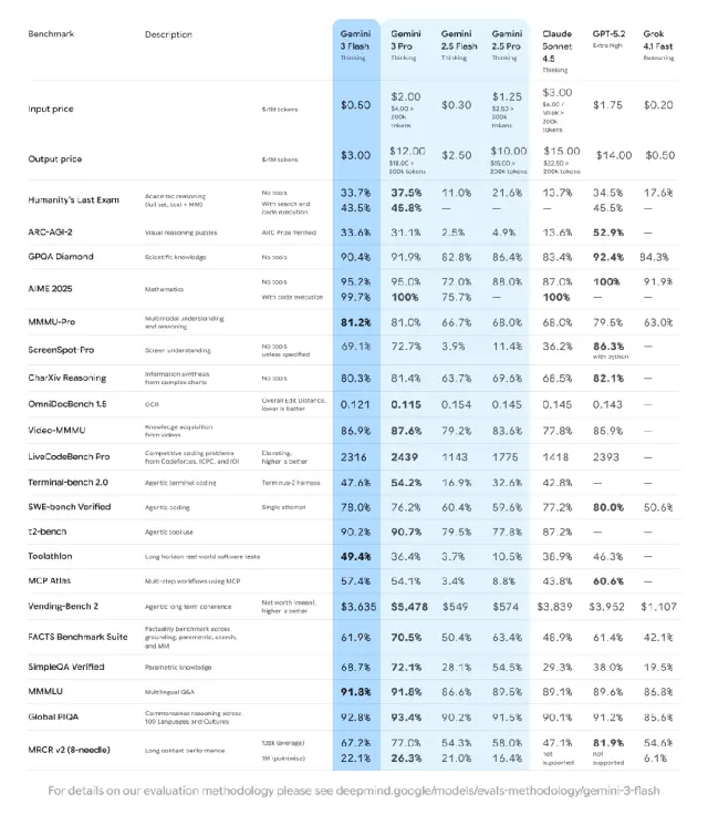 Gemini 3 Flash 在各项顶级基准测试中均展现出超高智能 | 图源:Google官网