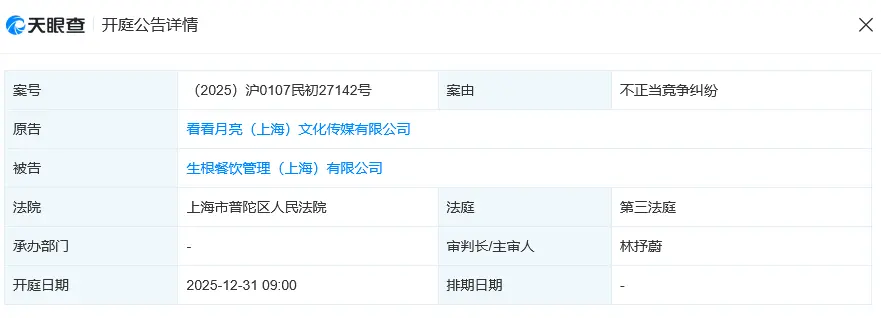 去年,橘子海乐队所属经纪公司看看月亮(上海)文化传媒有限公司就曾起诉一点点奶茶关联的生根餐饮管理(上海)有限公司不正当竞争,案件已在上海市普陀区人民法院开庭审理。