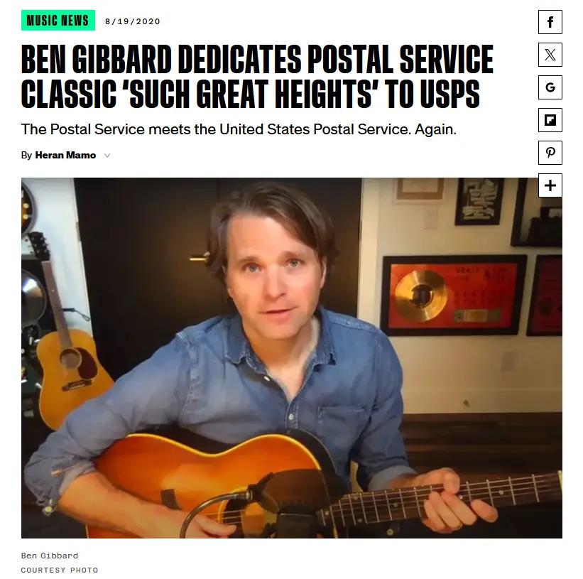 这一合作还产生了一些有趣的后续。例如,在2020年,乐队主唱Ben Gibbard在线上直播中将乐队的经典歌曲《Such Great Heights》献给了当时正面临运营挑战的USPS,为这个跨越近20年的故事增添了温情的续集。
