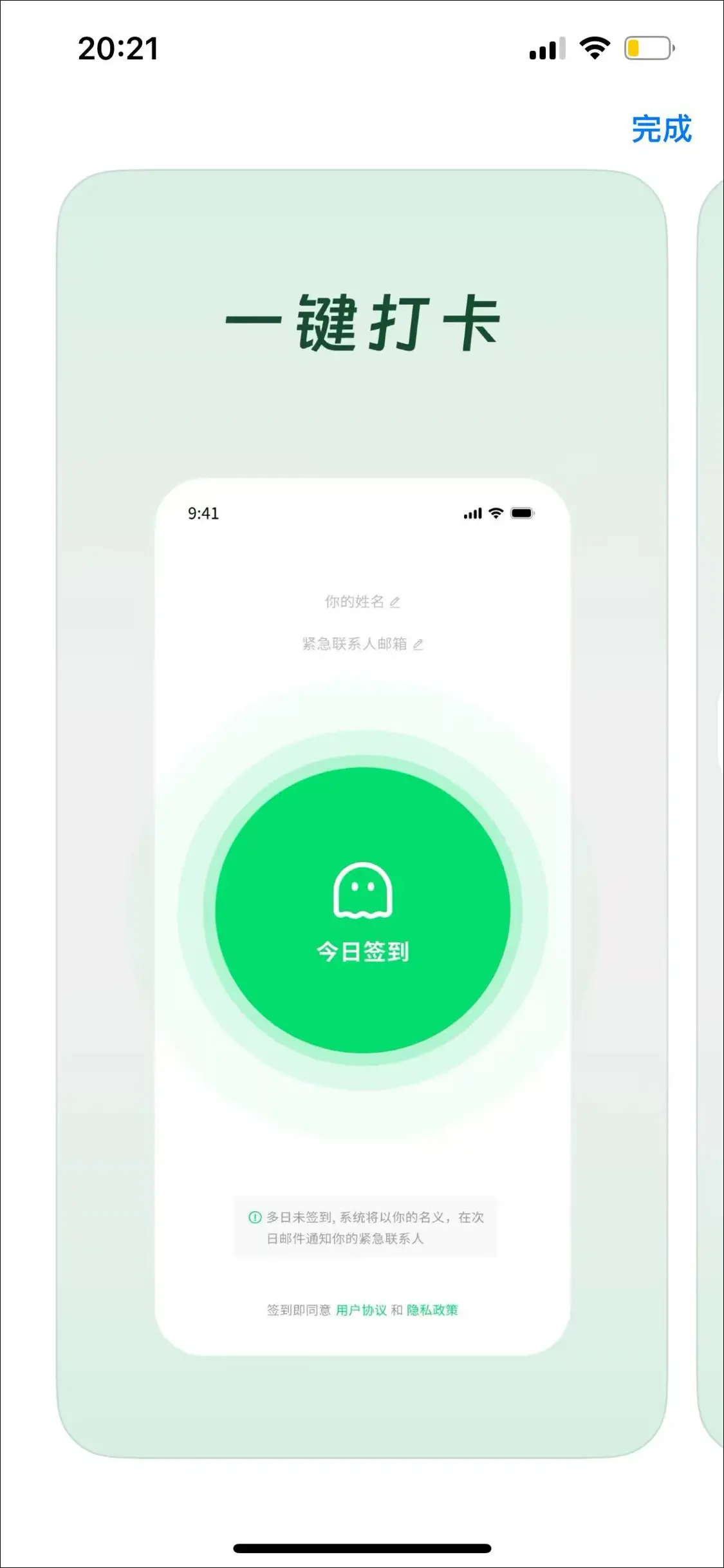 正如其名,这款App的功能非常简单。根据App Store下载页的功能介绍,这是一款为独居人群打造的轻量化安全工具。软件不需注册登录,首次使用只需填写联系人姓名与邮箱即可。每天打开应用轻轻一点完成签到,后台自动监测状态。