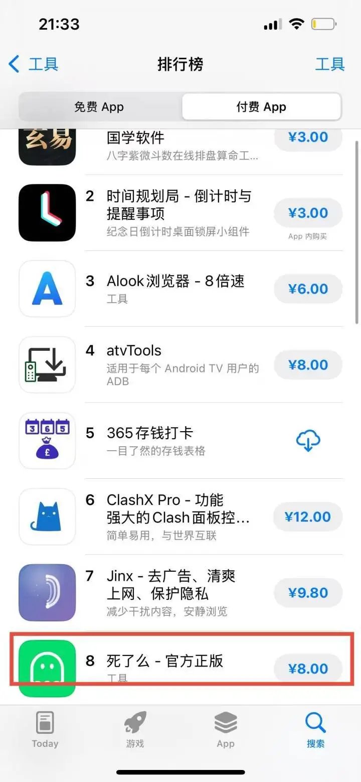 博主晒出的一张App Store截图显示,一款叫“死了么-官方正版”的App在排行榜位于收费榜55位。不过截至记者发稿,该App的下载量已经跃升至第8位。