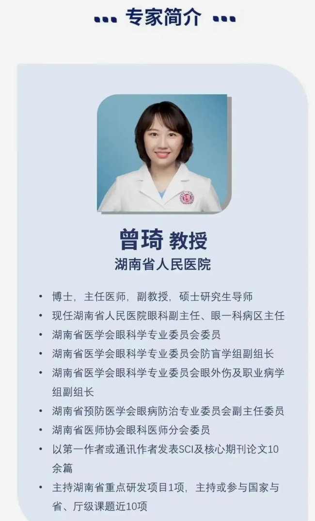 曾琦现任湖南省人民医院眼科副主任、眼科一病区主任,擅长复杂玻璃体视网膜手术、白内障及眼外伤治疗,以第一作者或通讯作者发表SCI及核心期刊论文20余篇。