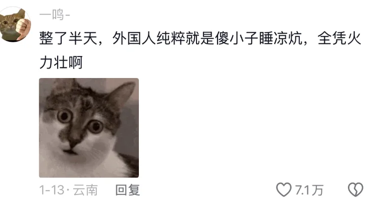 现在才知道,感情外国人纯粹是傻小子睡凉炕,全凭火力壮啊。