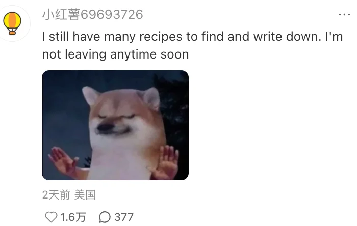 有外国网友马上出现并回答:我还有很多食谱需要寻找和记录,所以我暂时不会离开。