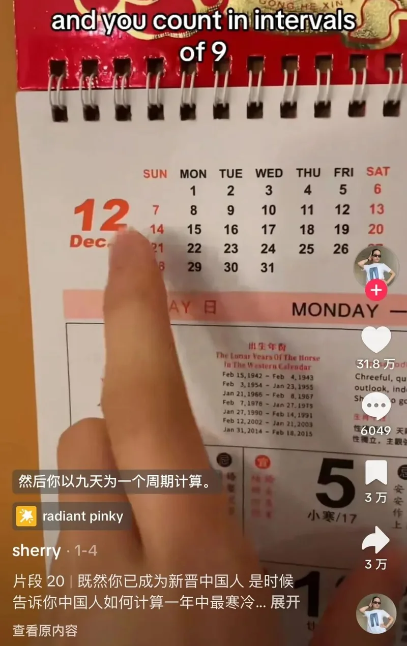 为了帮助大家更好地理解中国人冬季养生的底层逻辑,Sherry还拿出中国挂历手把手地教老外们“数九”,告诉他们冬天最冷的两周该如何度过。