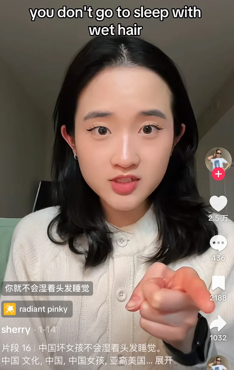 她告诉外国朋友们,中国人是不能湿着头发就睡觉的,你必须把它擦干。