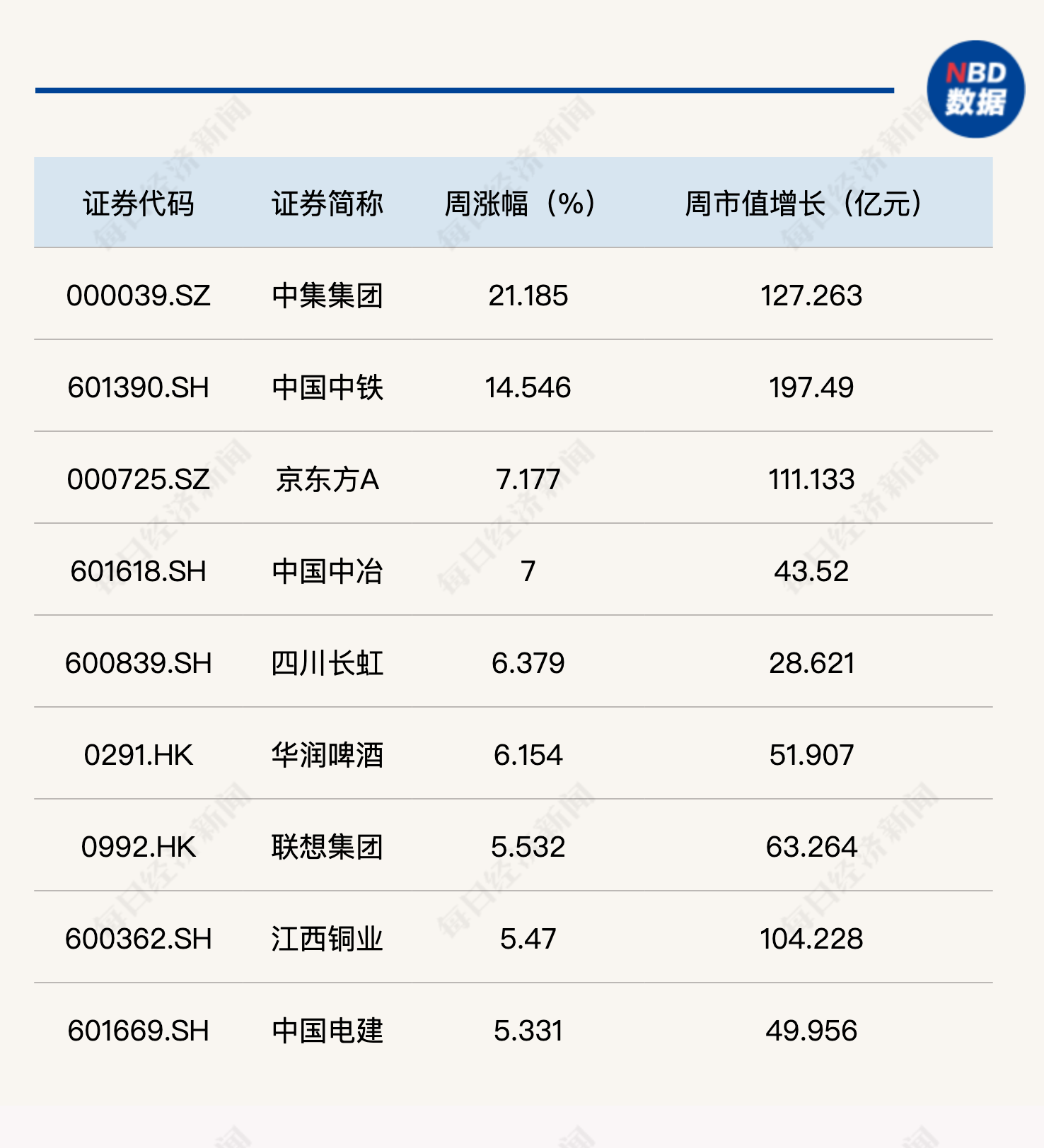 从本周每经品牌100指数成分股表现来看,仅中集集团和中国中铁的周涨幅超过10%。其中,中集集团周涨幅高达21.18%,周市值增长127亿元。