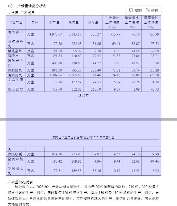 从产销量数据来看,两大单品的市场需求旺盛。2025年,清咽滴丸销售量达到1605.63万盒,同比增长66.88%。而速效救心丸虽然从销售盒数上看同比有所下降,但公司在年报中解释称,这是由于2025年新增了200粒、240粒、300粒等大规格包装的生产和销售,若按标准盒换算,实际生产和销售数量同比有较大幅度增加。