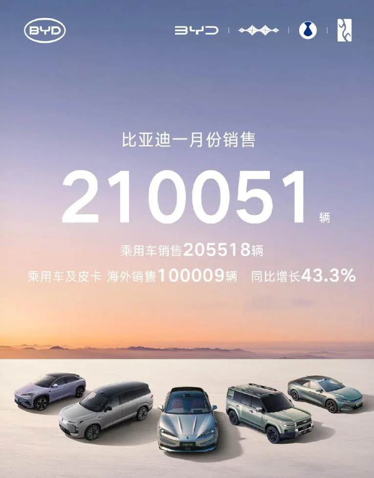 今年1月,比亚迪新能源汽车销量210051辆,同比下降30.11%。