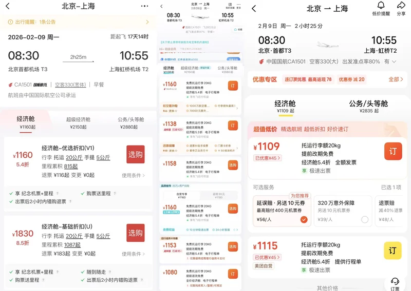 以2026年2月北京首都机场飞往上海虹桥的同一航班为例,航司APP上显示最优价格为1160元(未含机建燃油),在OTA平台上,叠加优惠后最低可达到1080元。