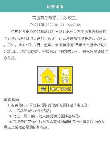 江苏省气象台发布今年首个高温黄色预警 Source 江苏省气象台2022年05月31日16时46分发布高温黄色预警信号:预计6月1日-3日徐州、宿迁、连云港最高气温将达35℃以上,另外,淮安6月1-2日,盐城、泰州和扬州2日最高气温也将达35℃以上,请注意防范。 扬子晚报/紫牛新闻记者 于丹丹 责任编辑:刘光博
