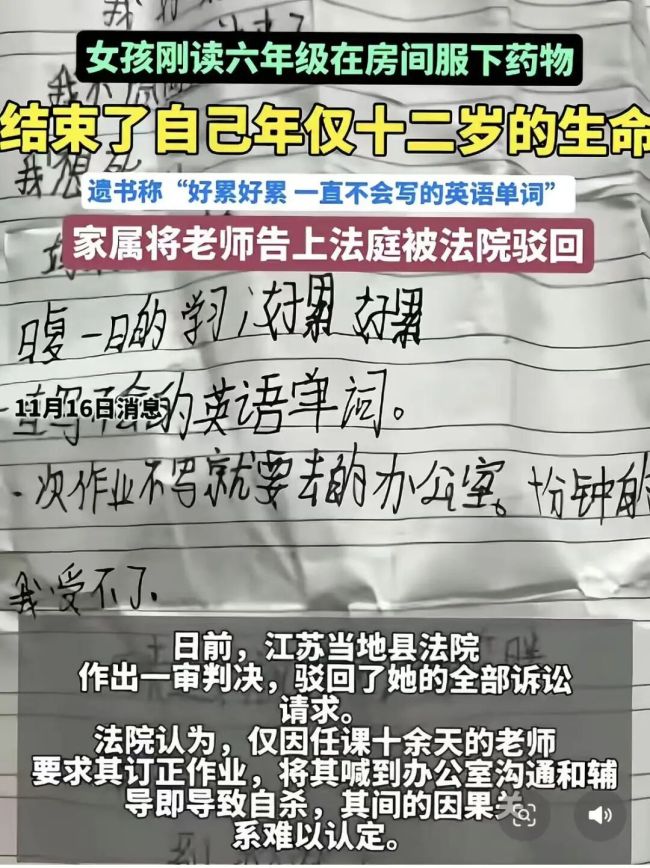 前不久,法院驳回了她的请求,原因是“难以认定任课仅十几天的老师,将孩子喊到办公室辅导会直接导致孩子自杀。”