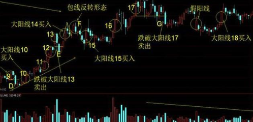 如图1.3 大阳线14买入后F点卖出。大阳线15买入,大阳线17被跌破时卖出。大阳线18买入。