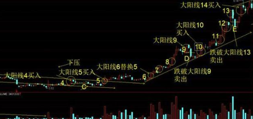 提示:如图1.2 大阳线6被大阳线7替换直到大阳线9被跌破D点卖出。大阳线10买入直到大阳线13被跌破时卖出,大阳线14买入。