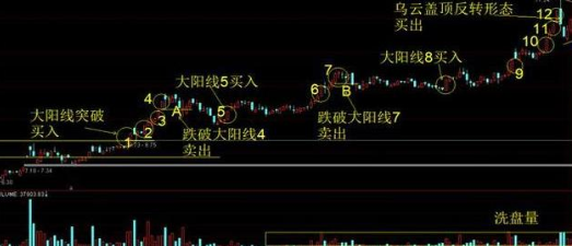 提示:如图1.1 大阳线1突破后买入,当大阳线2出现时就取代了大阳线1的作用,当大阳线2被跌破时A点卖出。大阳线3买入后发现乌云盖顶且成交量巨大B点卖出。大阳线4买入后失败C点卖出,大阳线5买入后最低价不破到大阳线6出现取代大阳线5。