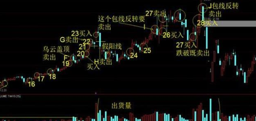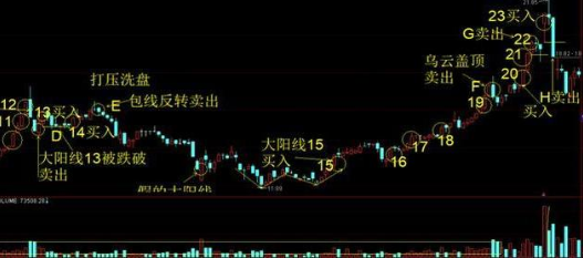 如图2.3 大阳线15是一个W反转形态买入,直到乌云盖顶F点卖出利润23个点。大阳线20买入到大阳线22被跌破G点卖出利润5个点。大阳线23买入H点卖出亏损10个点。