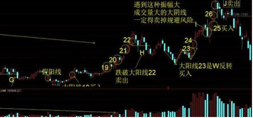 如图1.5 大阳线23是一个W反转形态买入,I点是一振幅大且成交量巨大的反转要卖出规避风险。大阳线25买入 ,大阳线26后面出现了J点同样包线反转形态振幅大且成交量巨大要卖出规避风险。