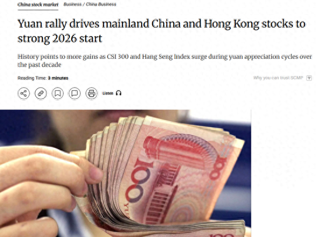 《南华早报》近日发文称,随着人民币突破关键的7元兑1美元水平,2026年以来,人民币计价的中国内地股市(沪深300指数)和香港恒生指数已上涨超过3%,这是此前两年半以来未见的情况。