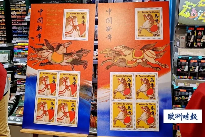 ▲ 法国当地时间2月6日,法国邮政在位于巴黎圣拉扎车站附近的法国邮政集邮墨方厅举行农历丙午马年生肖邮票的首发仪式。图为法国邮政发行的丙午马年生肖邮票。