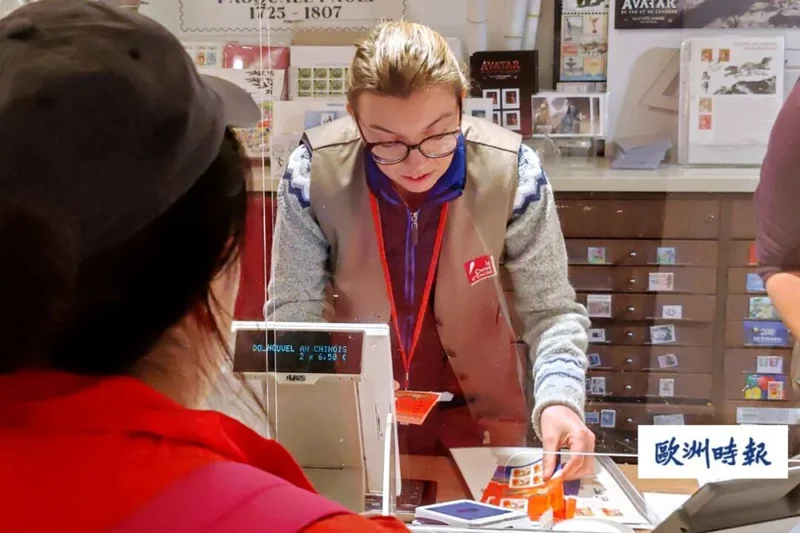 ▲ 法国当地时间2026年2月6日,法国邮政在位于巴黎圣拉扎车站附近的法国邮政集邮墨方厅举行农历丙午马年生肖邮票的首发仪式。图为集邮爱好者向法国邮政工作人员购买马年邮票。