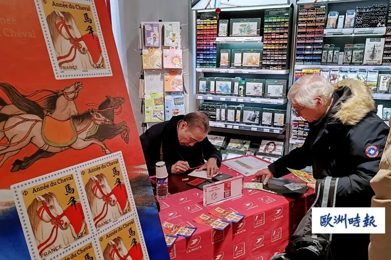 ▲ 法国当地时间2026年2月6日,法国邮政在位于巴黎圣拉扎车站附近的法国邮政集邮墨方厅举行农历丙午马年生肖邮票的首发仪式。图为马年邮票设计师陈江洪(左)为集邮爱好者签名留念。